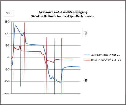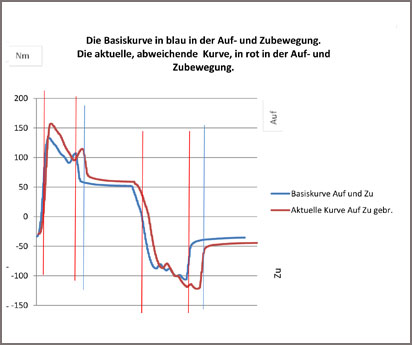 2. jeder Bewegung der Armatur mit der Basiskurve, wie sie im Neuzustand war, im aktuellen Betriebszustand verglichen. Werden keine Abweichungen festgestellt, so arbeitet die Armatur mit Antrieb einwandfrei. (Bild 02)