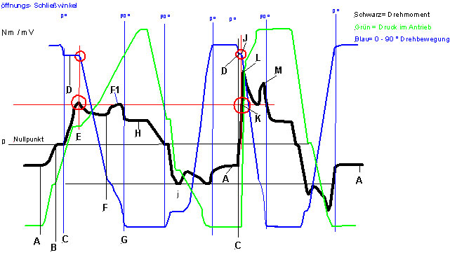 Zum besseren Verständnis sind hier die Luftdruckdaten im Antrieb und einem Wegaufnehmer 0° bis 90° mit aufgezeichnet. Sodass bei jedem Drehwinkel ein entsprechendes Drehmoment zugeordnet wird.