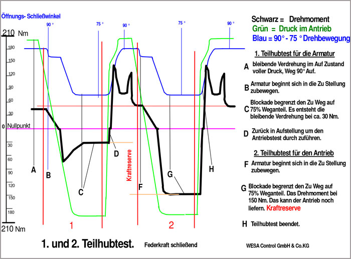 Solch eine sicherheitstechnische Betrachtung ist der Beginn des Teilhubtest. Keine von den im Einsatz befindlichen anderen Messmethoden haben diese Möglichkeit. Ist die bleibende Verdrehung nicht gegen Null gelaufen, kann aber muss nicht, eine festsitzende Armatur vorliegen. Der Teilhubtest wird es jetzt beweisen.