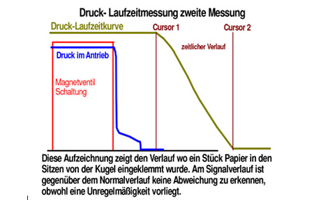 Die Armatur wurde in ihrem vorhandenen Zustand gefahren. Die Kurven wurden von beiden Systemen aufgezeichnet. Bei der Drucklaufzeitmessung ist hier nur das Zufahren dargestellt. Da keine Störung vorhanden war sind die Kurven so als Normalzustand deklariert worden.